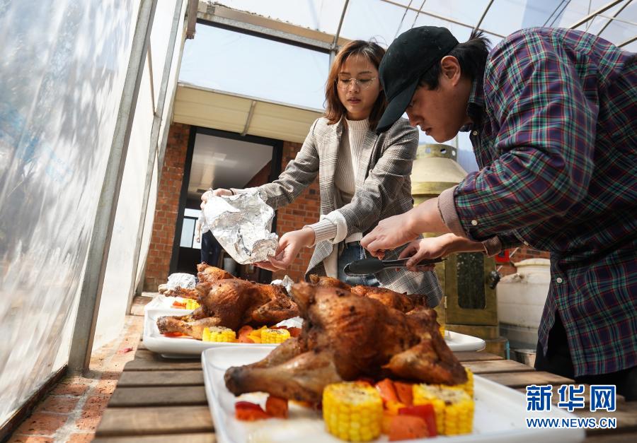 謝丞恩(左)和二哥謝丞皓在農場內給參觀的客人準備烤雞(2月20日攝)。新華社記者 季春鵬 攝