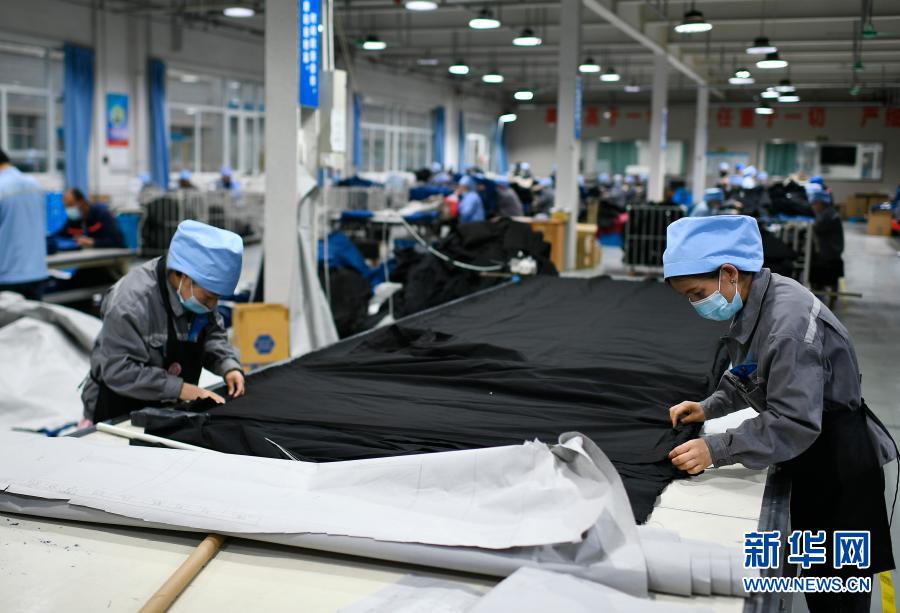 2月24日,寧夏同心縣中核(寧夏)同心防護科技有限公司扶貧車間的女工在進行服裝加工。