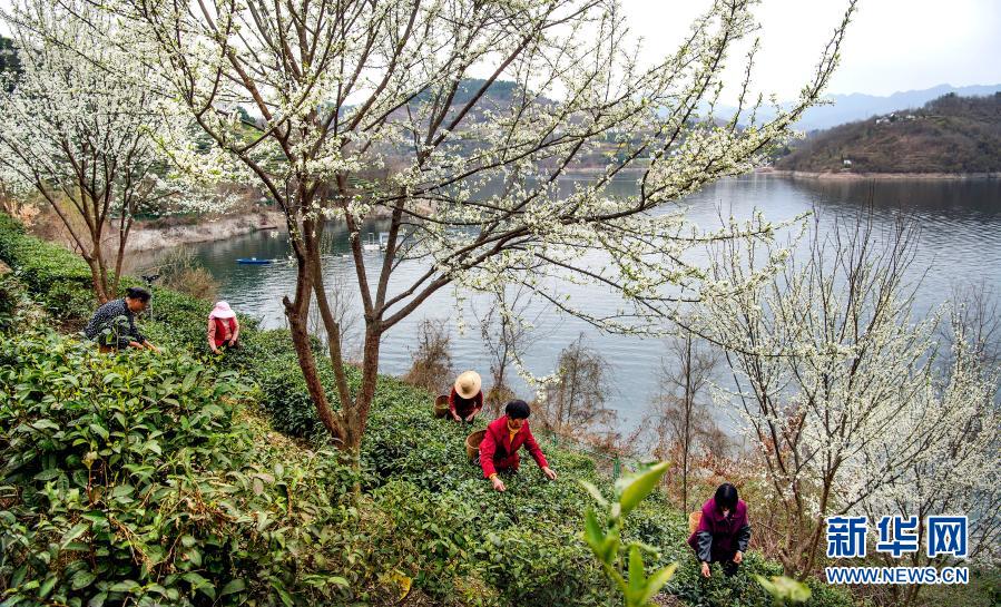 3月4日,安康市漢濱區流水鎮群眾在漢江之濱采摘新茶。