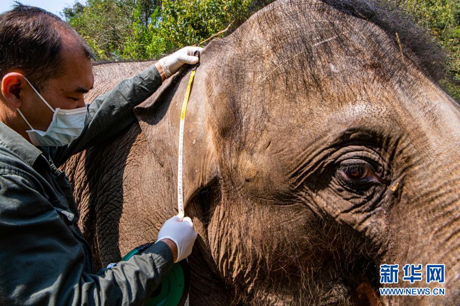 “象爸爸”為一頭名叫“小強”的大象檢查耳朵(3月6日攝)。新華社記者 江文耀 攝
