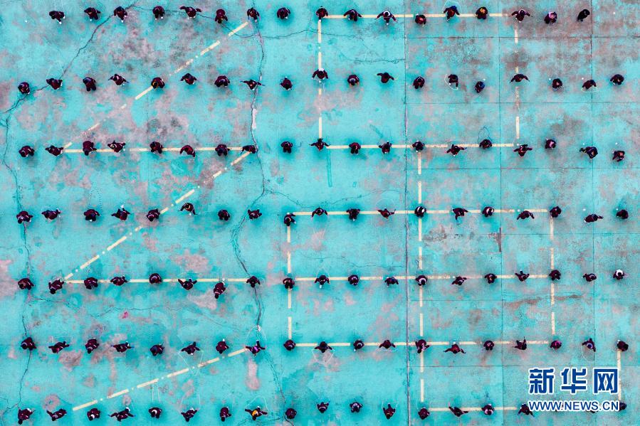騎路小學學生們在大課間進行跳繩鍛煉(3月9日攝,無人機照片)。新華社記者 李博 攝