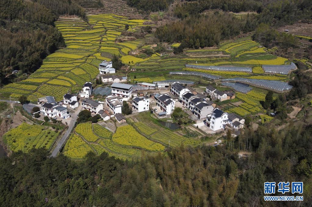 這是3月26日拍攝的花海中的黃山市徽州區靈山村(無人機照片)。