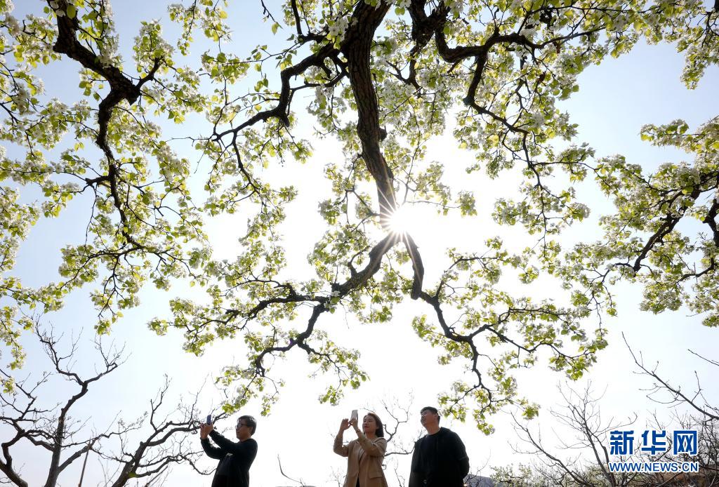 4月11日,游客(ke)在遷西縣東蓮花(hua)院鎮西山(shan)村(cun)的(de)梨(li)園內拍(pai)照。