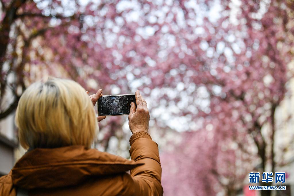 4月13日(ri),一名(ming)游人在德(de)國(guo)波恩老城區用手(shou)機拍(pai)攝盛(sheng)開的櫻花。