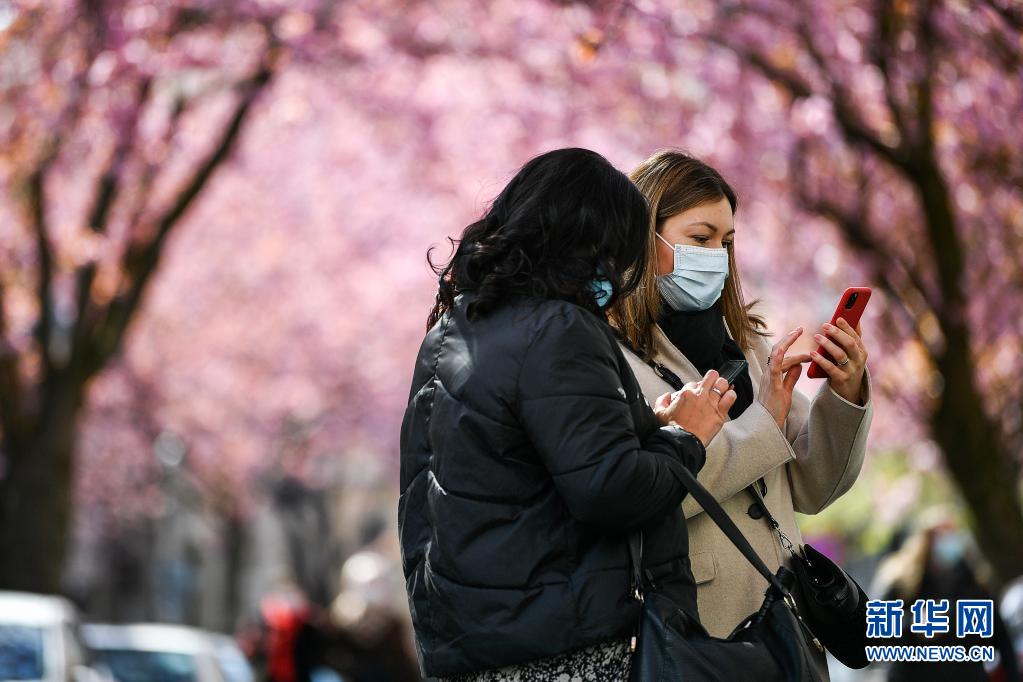 4月13日(ri),兩名游人(ren)在(zai)德(de)國波恩老城區(qu)用手(shou)機拍攝盛開的櫻花。