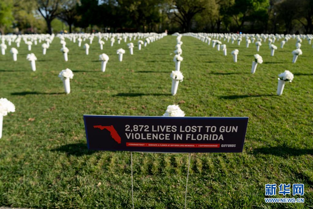 4月13日,一塊標牌豎立在美國(guo)華盛(sheng)頓國(guo)家廣場草坪上,顯(xian)示美國(guo)佛(fo)羅里達州(zhou)共(gong)有2872人死(si)于(yu)槍擊事件。
