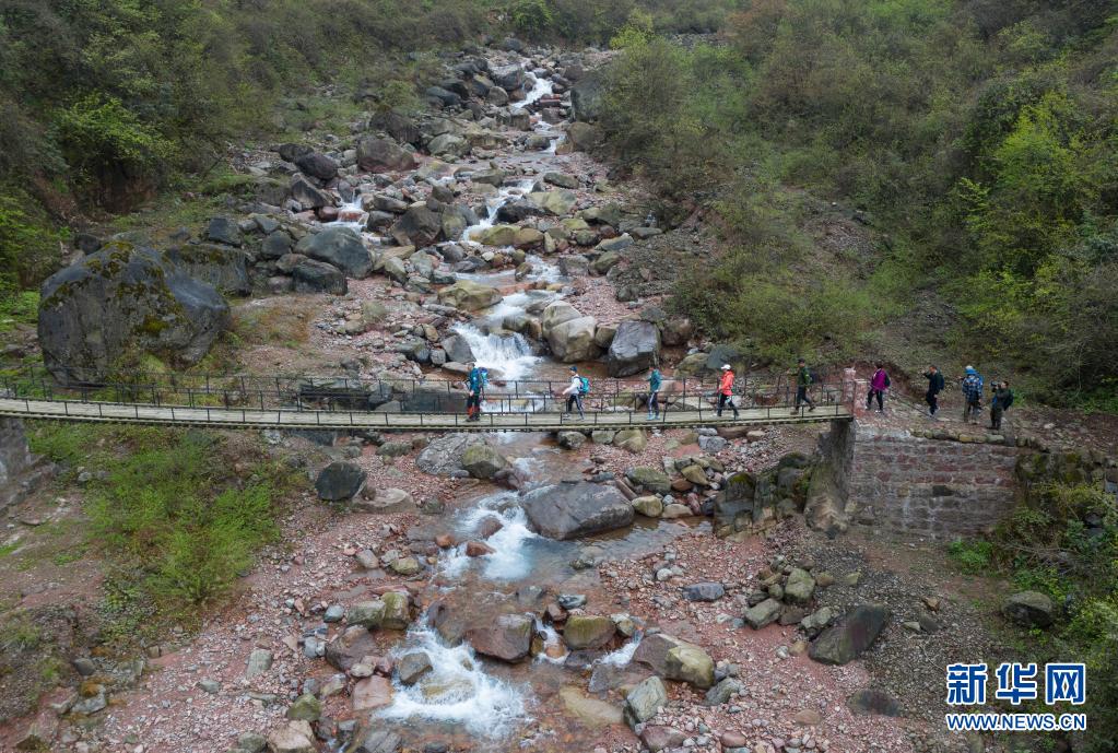 4月(yue)18日,徒步(bu)愛好(hao)者(zhe)沿著大相嶺茶馬古道,通過一座吊橋。新華社記者(zhe) 江(jiang)宏景 攝
