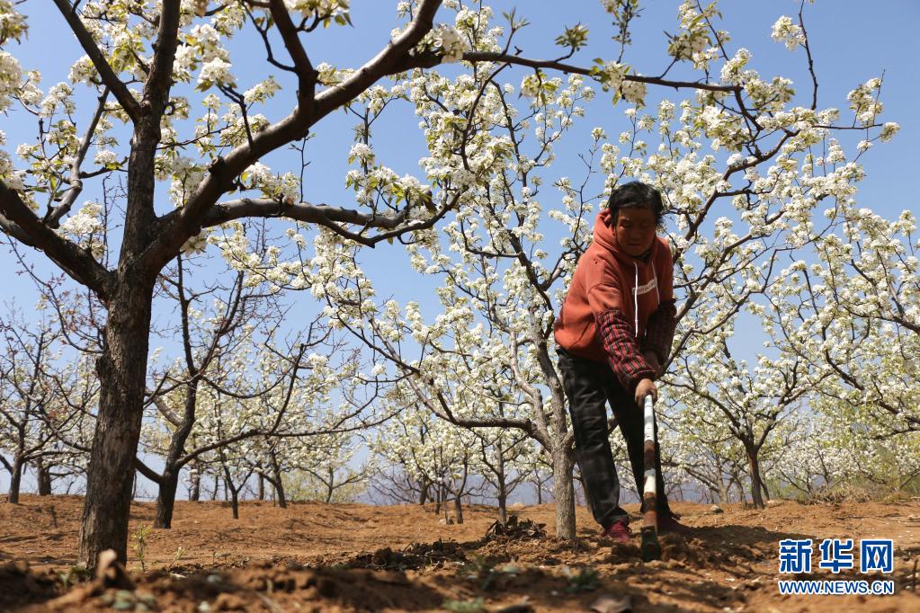 4月19日,農民在河(he)北省承(cheng)德縣(xian)新杖(zhang)子(zi)鎮葦子(zi)峪(yu)村梨園(yuan)里除草(cao)。
