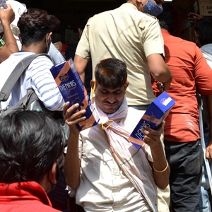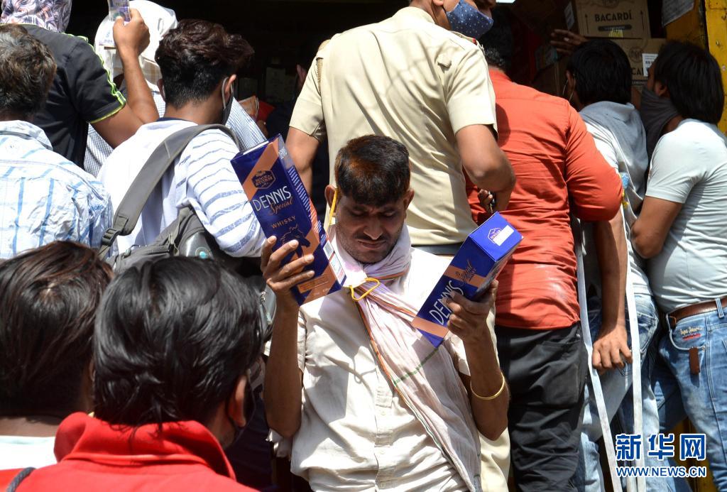 4月19日(ri),印度新德里居民在全城實施封鎖前(qian)搶購酒品(pin)。