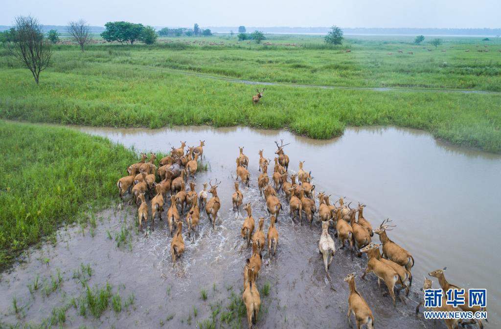 5月17日,一群麋鹿在石首麋鹿國家級自然保護區內活動(無人機照片)。新華社記者 肖藝九 攝