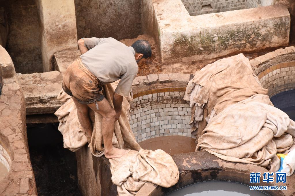 5月30日,工人正在摩洛哥非斯古城內的皮革染坊中勞作。