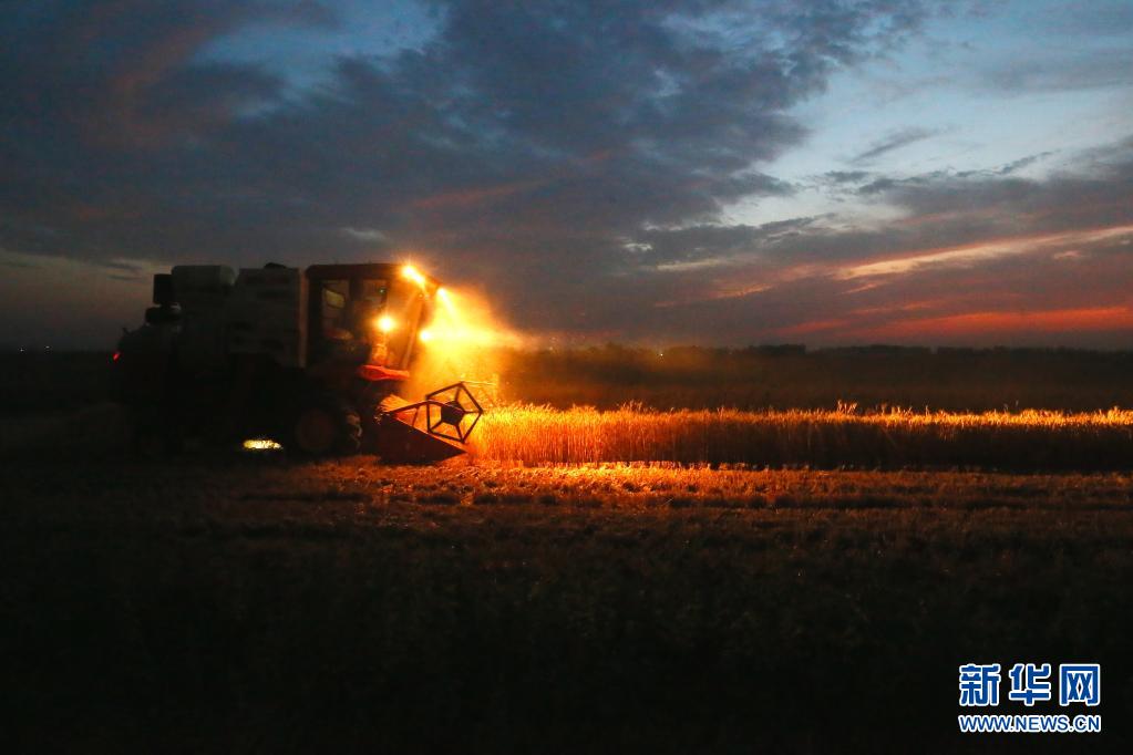 6月19日,收割機在山東省青島市即墨區段泊嵐鎮葉家宅科村的麥田內作業。