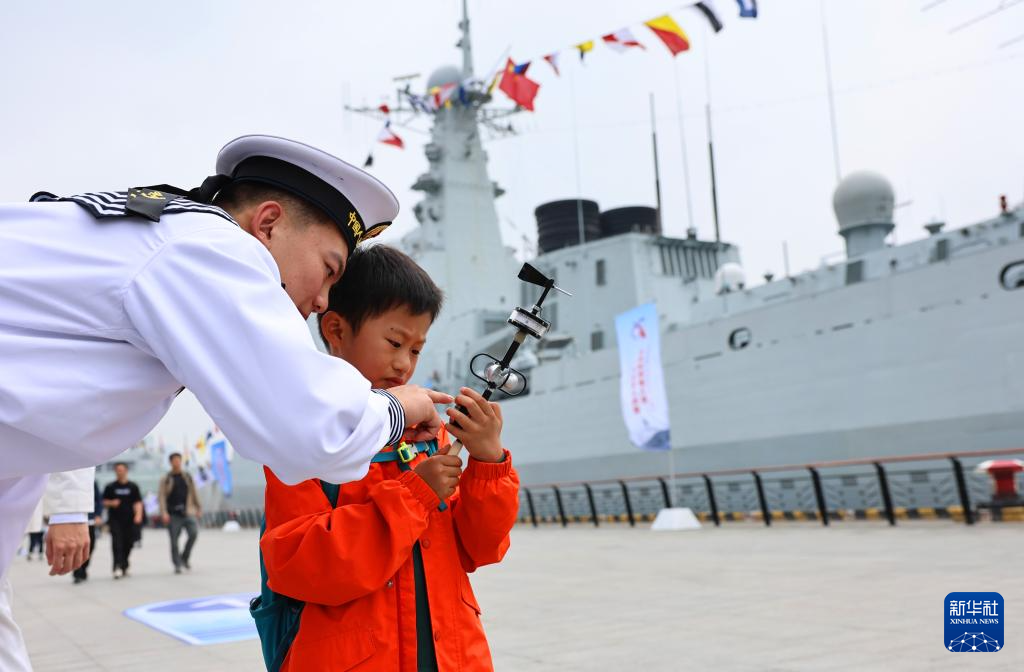 4月22日,一個小朋友在海軍戰士指導下體驗使用三杯風向風速儀。當日,在人民海軍成立76周年之際,駐滬海軍部隊聯合上海市雙擁辦共同組織以“上海·海上”為主題的艦艇開放活動。