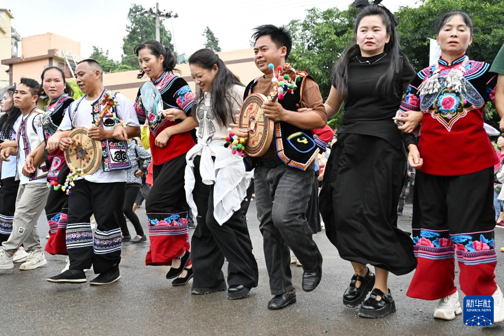 7月12日,游客在云南省文山壯族苗族自治州文山市新平社區莊子田村與當地村民一起體驗弦子舞。