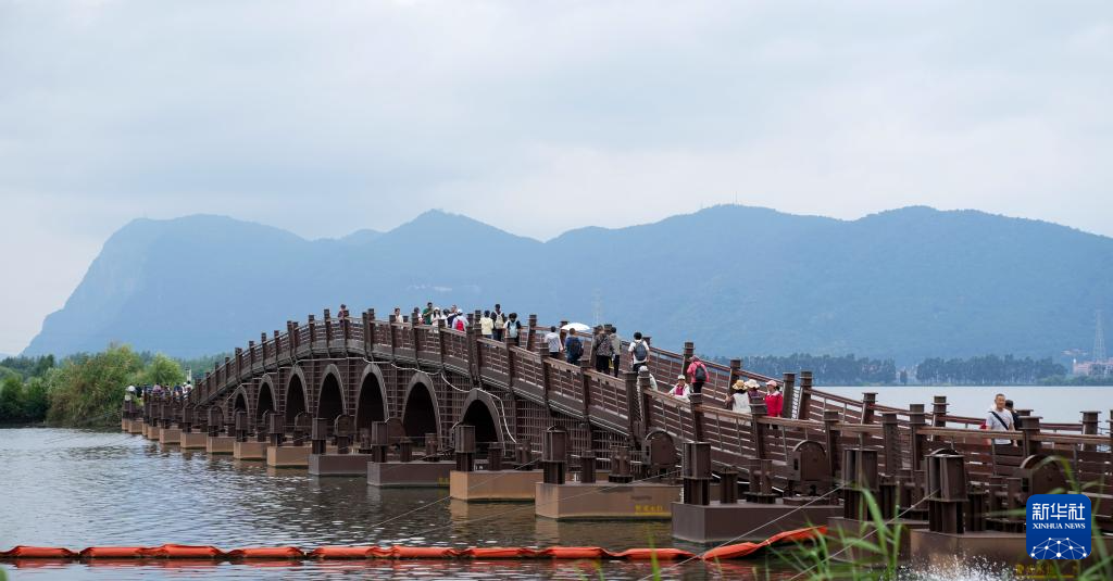 7月12日,游客在昆明市東風壩七孔浮橋游覽參觀。