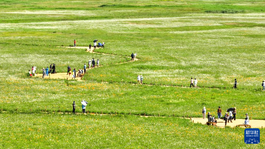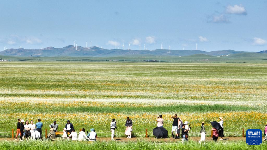 7月13日,游客在內蒙古錫林郭勒盟正藍旗金蓮川草原賞花游玩(無人機照片)。