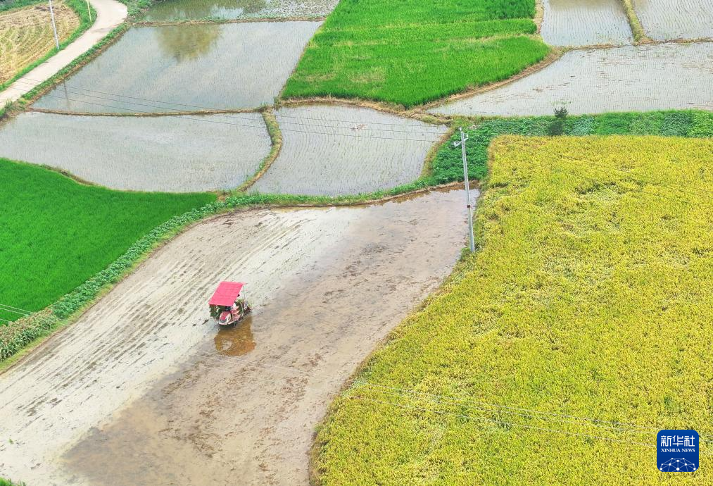 7月13日,湖南省衡陽市衡東縣霞流鎮農民駕駛農機翻耕稻田(無人機照片)。