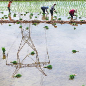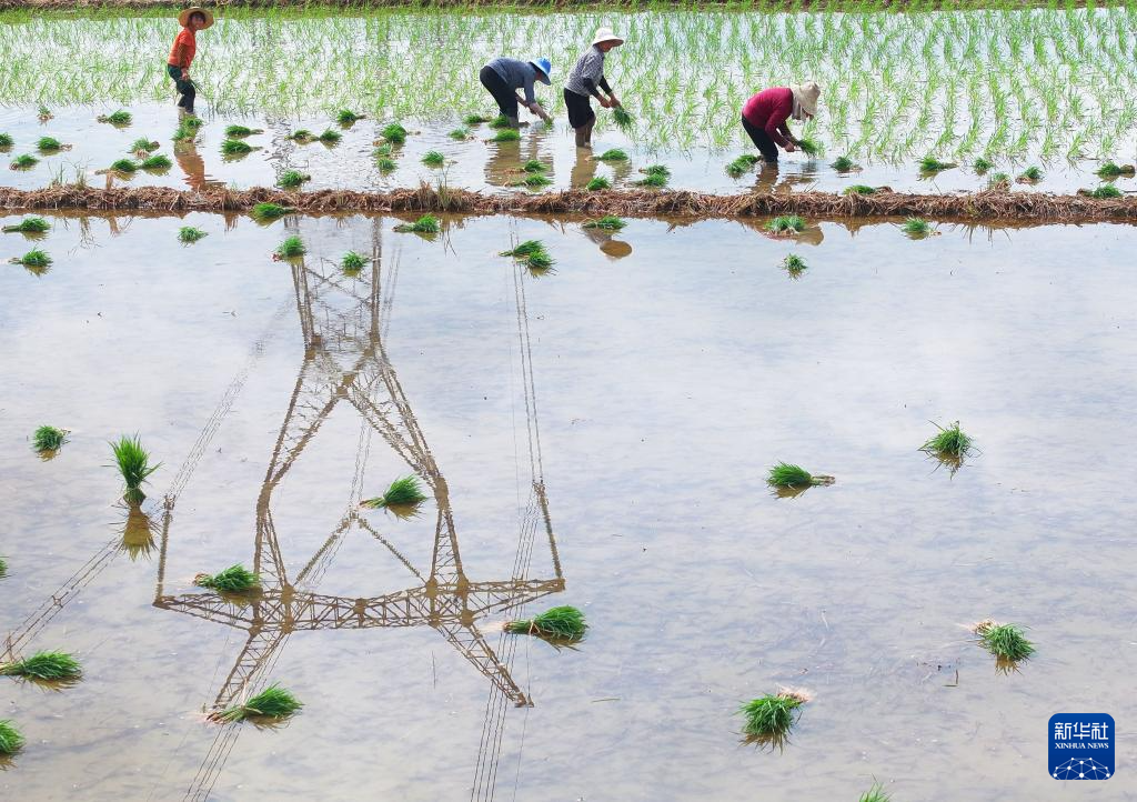 7月13日,湖南省衡陽市衡東縣霞流鎮農民在搶插晚稻(無人機照片)。