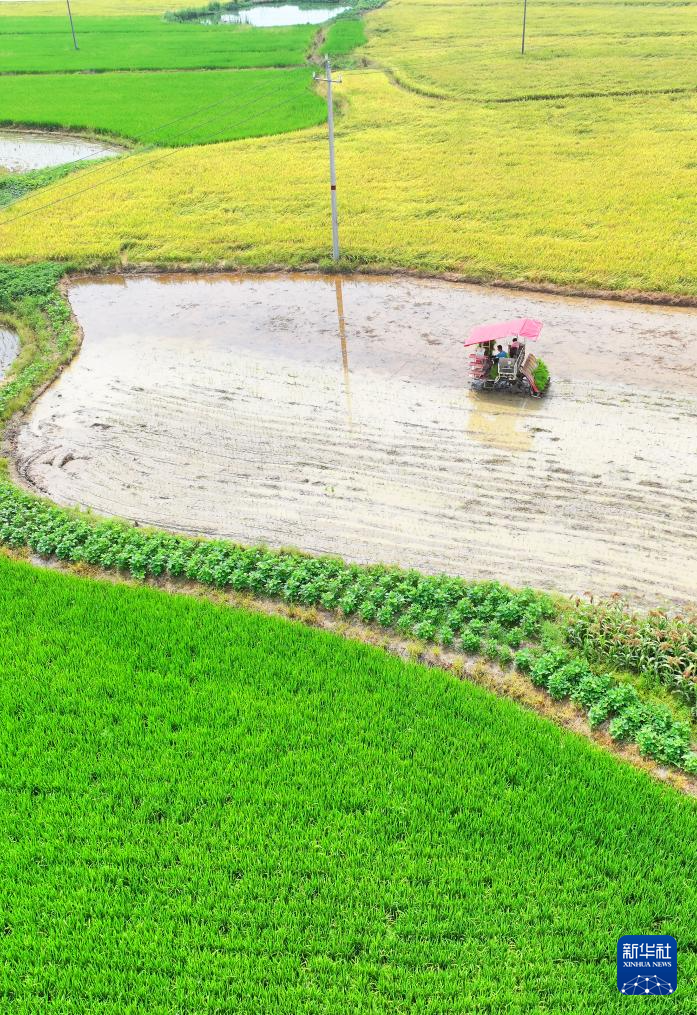 7月13日,湖南省衡陽市衡東縣霞流鎮農民駕駛農機進行晚稻插秧工作(無人機照片)。