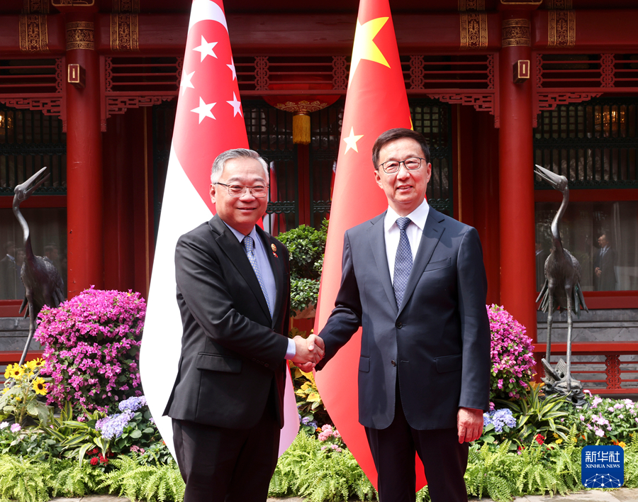 9月4日,國家副主席韓正在北京會見來華出席紀念中國人民抗日戰爭暨世界反法西斯戰爭勝利80周年活動的新加坡副總理兼貿工部長顏金勇。