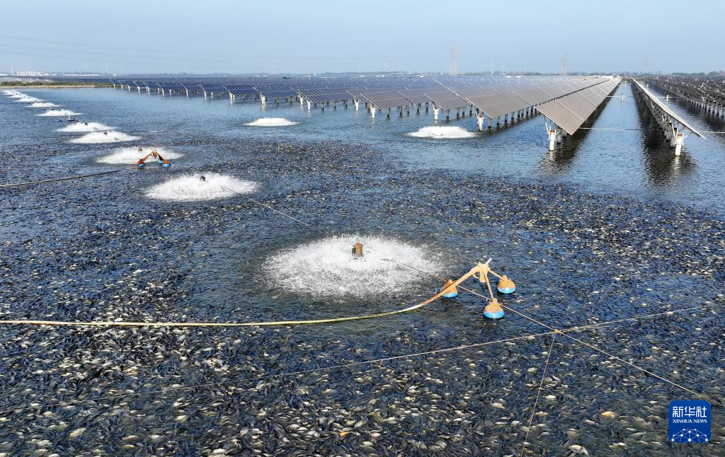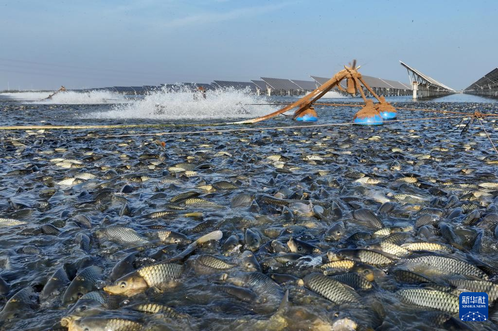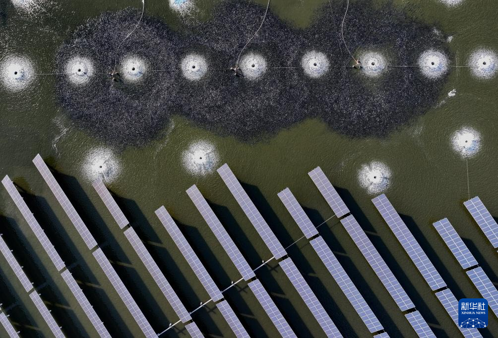 9月29日,魚群在河北省唐山市豐南區黑沿子鎮“漁光一體”現代漁業產業園魚塘內覓食(無人機照片)。