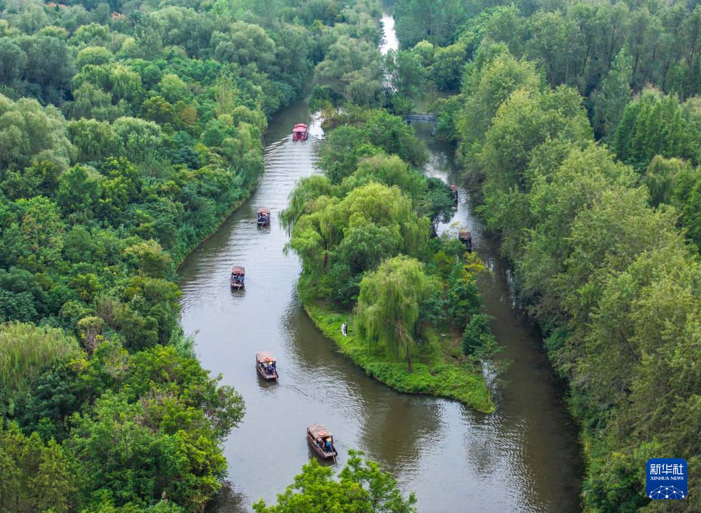 10月1日,游客在江蘇省泰州市姜堰區溱湖國家濕地公園乘船游玩(無人機照片)。