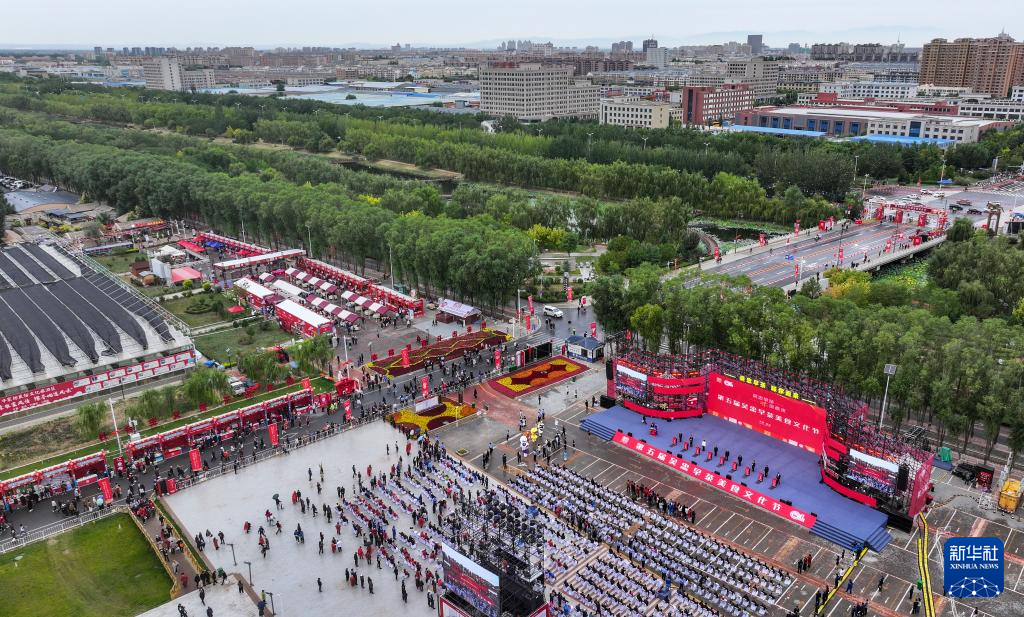 這是10月1日在在寧夏吳忠市利通區牛家坊民俗文化村拍攝的第五屆吳忠早茶美食文化節活動現場(無人機照片)。