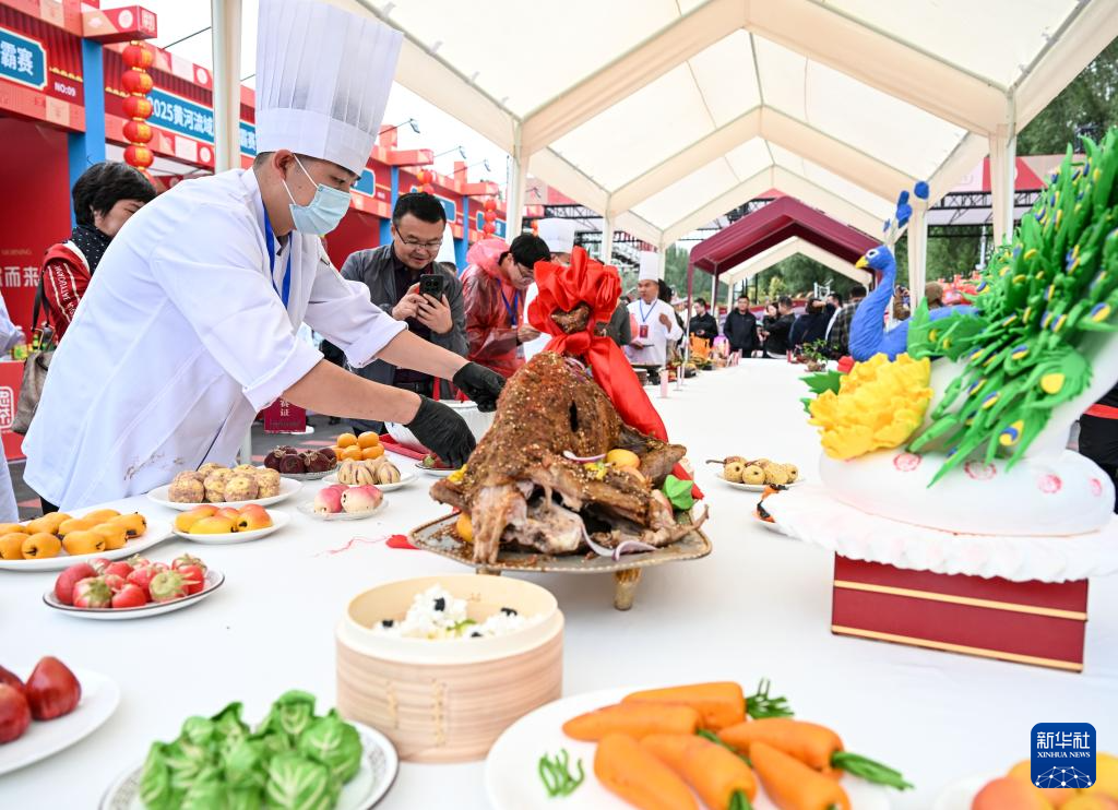 10月1日,在寧夏吳忠市利通區牛家坊民俗文化村舉行的第五屆吳忠早茶美食文化節廚藝爭霸賽上,廚師為游客展示、介紹特色美食。