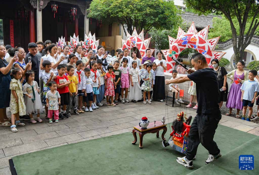 10月1日,在浙江省金華市非遺館,浙江婺劇藝術研究院演員為游客表演提線木偶戲《鐘馗醉酒》。