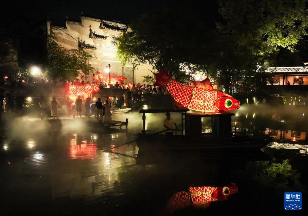 10月1日晚,在安徽省黃山市黟縣秀里古村,魚燈隊伍在古村巡游(無人機照片)。
