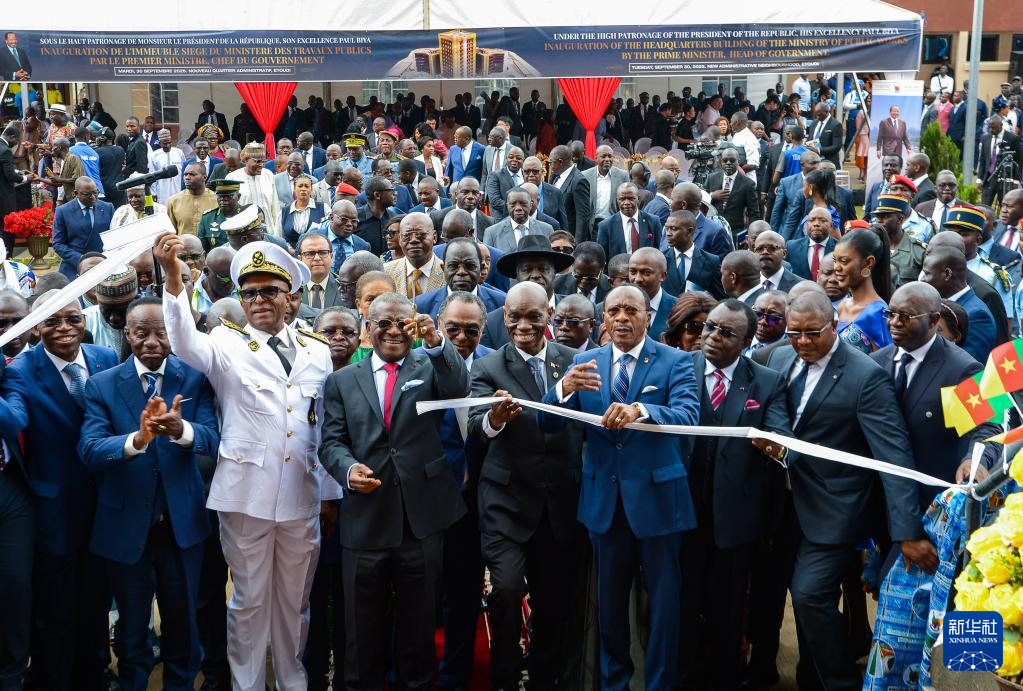 9月30日,在喀麥隆首都雅溫得,喀總理恩古特(左四)在公共工程部辦公大樓揭牌儀式上剪彩。