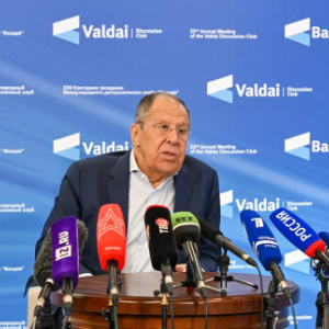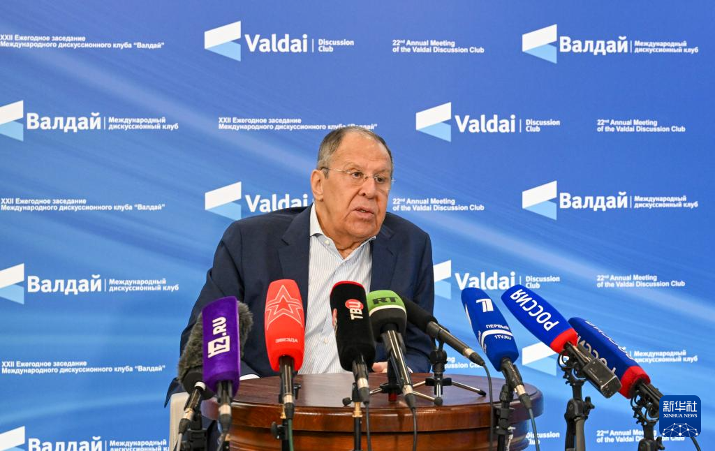 9月30日,俄羅斯外交部長拉夫羅夫在索契舉辦的俄智庫瓦爾代國際辯論俱樂部第22屆年會會場回答記者提問。