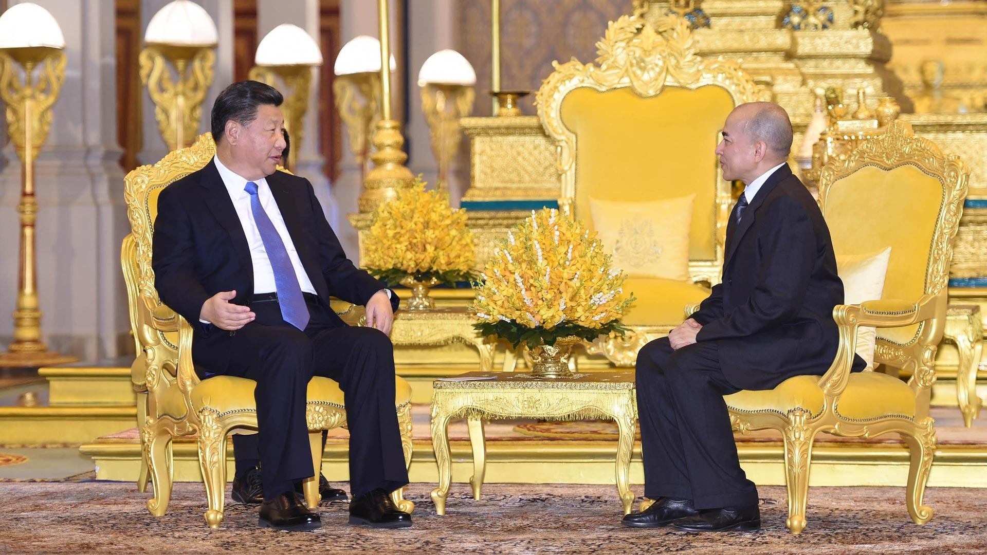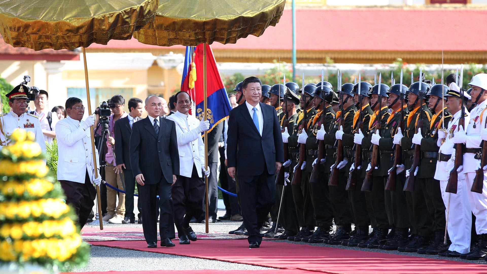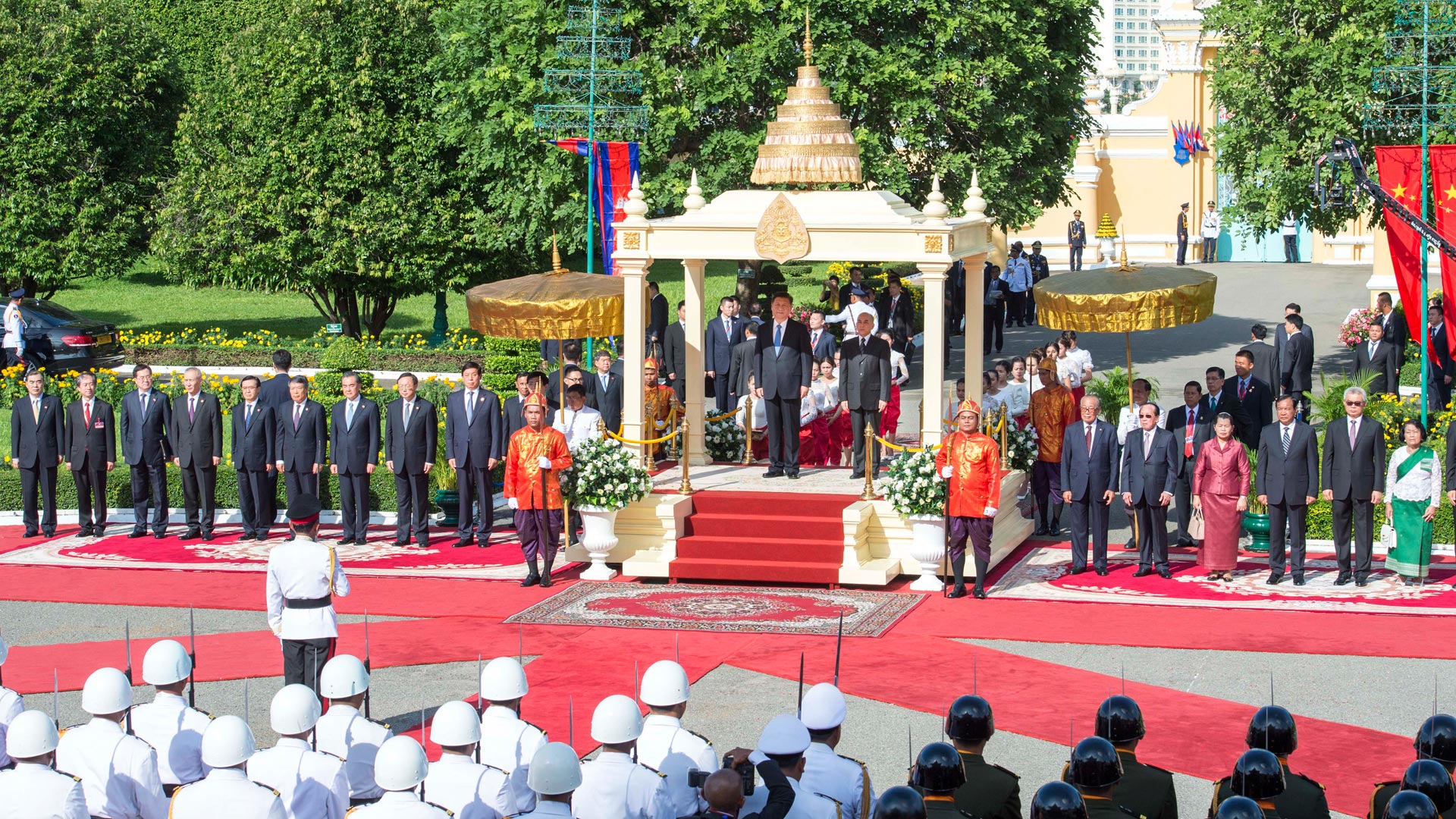 10月13日,國家主席習近(jin)平(ping)在金邊會見(jian)柬埔(pu)寨國王西哈(ha)莫(mo)尼(ni)。會見(jian)前,習近(jin)平(ping)出席西哈(ha)莫(mo)尼(ni)在王宮舉行的(de)盛大歡迎儀式。 新華社記者 王曄(ye) 攝
