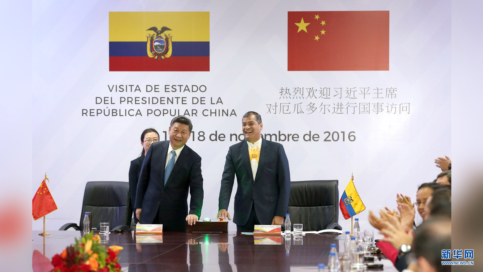 當地時間11月17日,國家主席習近平在基多同厄瓜多爾總統科雷亞舉行會談。這是會談后,兩國元首見證雙邊合作文件的簽署。 新華社記者 鞠鵬攝2016-11-18