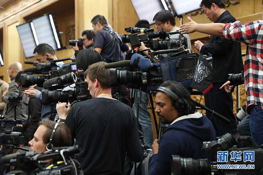 中外記者在見面會現場進行準備工作-新華網