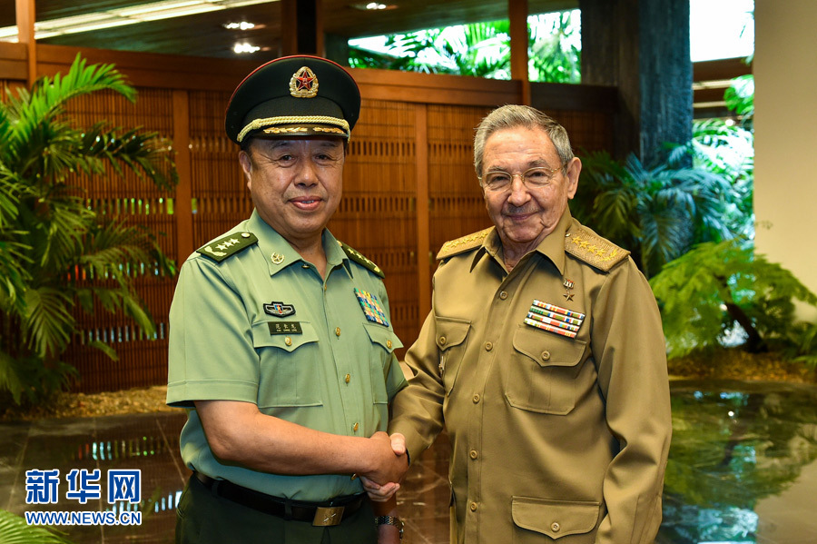 ?? 6月15日,古巴國務委員會主席兼部長會議主席勞爾·卡斯特羅(右)在首都哈瓦那會見正在古巴訪問的中央軍委副主席范長龍。 新華社發