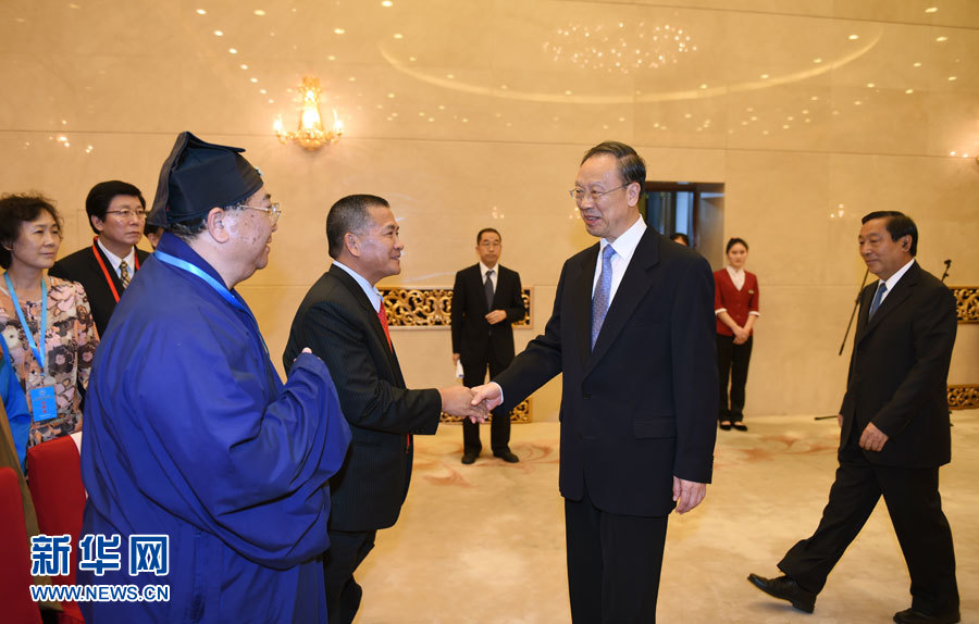 ?? 9月4日,紀念中國人民抗日戰爭暨世界反法西斯戰爭勝利70周年宗教界和平祈禱活動在北京舉行。這是中共中央書記處書記、全國政協副主席杜青林,全國政協副主席齊續春會見參加和平祈禱活動的宗教界代表。新華社記者 張領 攝