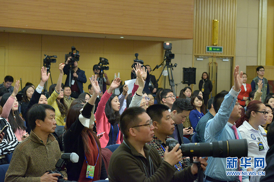 ????3月13日上午10時,十二屆全國人大三次會議新聞中心邀請四川大學校長謝和平、江蘇省教育廳廳長沈健、廣東省教育廳廳長羅偉其、海南大學校長李建保、貴州大學校長鄭強就完善高等教育治理結構的相關問題回答中外記者提問。圖為現場記者踴躍提問。新華網/中國政府網 郭小天 攝