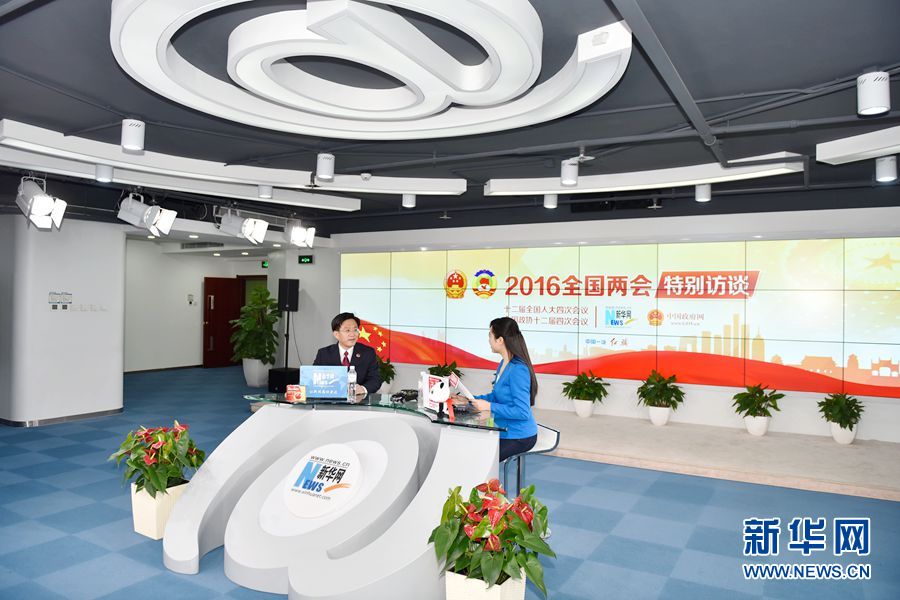 ????2016年3月13日,最高人民檢察院辦公廳主任、新聞辦主任王松苗做客新華網兩會訪談直播間。圖為新華網兩會訪談直播間。新華網 付宇鵬 攝