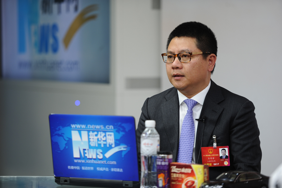 ????2016年3月14日,全國人大代表、上海均瑤(集團)有限公司董事長王均金做客新華網兩會訪談直播間。圖為王均金回答主持人問題。新華網 盧志佳攝