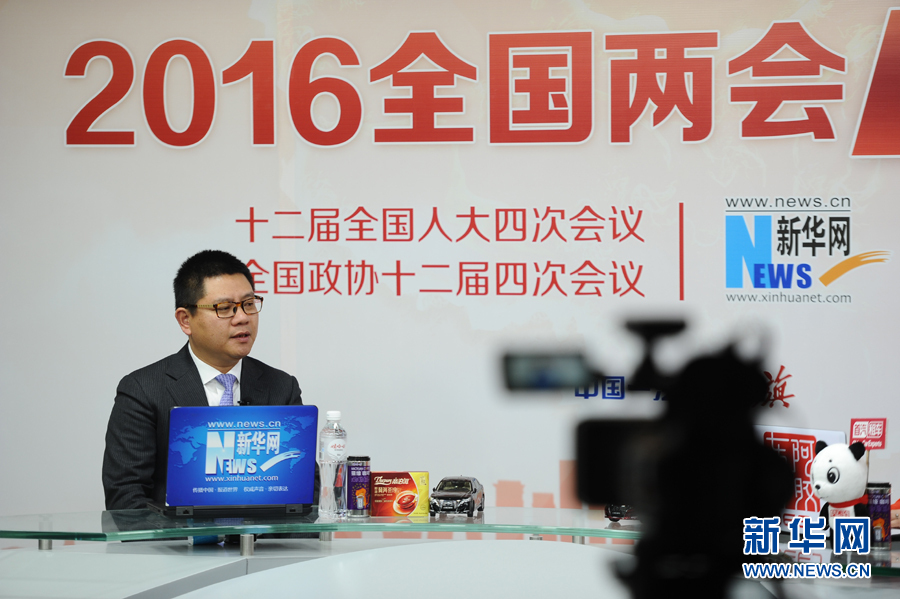 ????2016年3月14日,全國人大代表、上海均瑤(集團)有限公司董事長王均金做客新華網兩會訪談直播間。圖為王均金在訪談現場。新華網 盧志佳攝