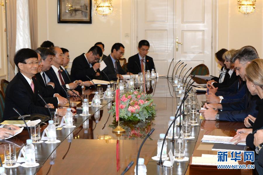9月12日,克羅地亞總理普連科維奇(右二)在首都薩格勒布會見到訪的習近平主席特使、中共中央政治局委員、中央政法委書記孟建柱(左一)。新華社記者高磊攝