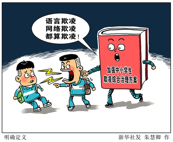 毆打、往身上澆開水、在網上傳(chuan)播個人隱私……近(jin)年來,中(zhong)小學(xue)生(sheng)欺凌事件(jian)時有發(fa)生(sheng),行(xing)為手(shou)段層(ceng)出不窮(qiong)。為防治(zhi)學(xue)生(sheng)欺凌行(xing)為,教育、公安、民政、婦聯等11部門一齊向學(xue)生(sheng)欺凌行(xing)為“亮劍”,共同印發(fa)了(le)《加強中(zhong)小學(xue)生(sheng)欺凌綜合治(zhi)理方案》。而這是否(fou)真(zhen)的能(neng)讓我(wo)們(men)的孩子免于欺凌的恐懼?