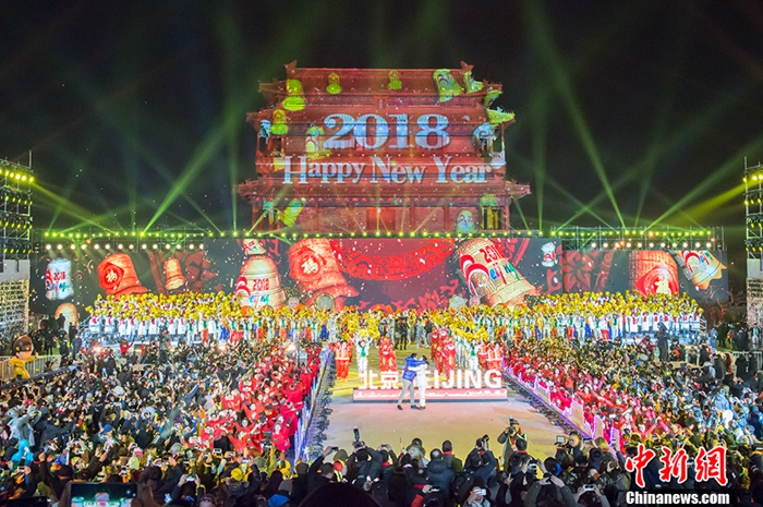 2018年1月1日,2018北京新年倒計時活動暨北京冰雪文化旅游節開幕式在北京永定門南廣場舉行。多國駐華使節、首都各行業的“北京榜樣”、北京旅游行業代表、中外游客、學生和市民代表共一千余人共同迎接新年的到來。中新網記者 富宇 攝