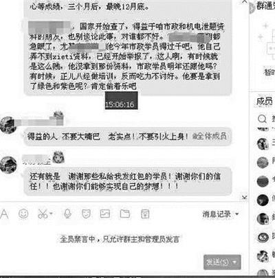 被指(zhi)泄題(ti)(ti)后(hou),有(you)考生(sheng)曾向北(bei)青(qing)報記者提供(gong)過一張QQ群聊(liao)天截圖(tu)。截圖(tu)中,一名培訓機構的(de)員(yuan)工(gong)稱,“國家開始(shi)查(cha)(泄題(ti)(ti))了,得益于咱市(shi)政和(he)機電(dian)泄題(ti)(ti)資料(liao)的(de)朋(peng)友(you)(you),也別談論此事,對誰都(dou)不(bu)好(hao)”,并(bing)在群里(li)對那些私發紅包(bao)(購買答案(an)(an)(an))的(de)學(xue)員(yuan)表(biao)示感謝。隨(sui)后(hou),北(bei)青(qing)報記者添加其為好(hao)友(you)(you),該(gai)工(gong)作人員(yuan)稱,只要交(jiao)3萬元,2018年考試也可(ke)以給靠譜答案(an)(an)(an),并(bing)稱試題(ti)(ti)和(he)答案(an)(an)(an)是“別的(de)學(xue)員(yuan)傳來的(de),很安全,不(bu)用操心”。