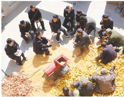 圖為農信社工作人員與農民交談,了解生產情況和貸款需求。