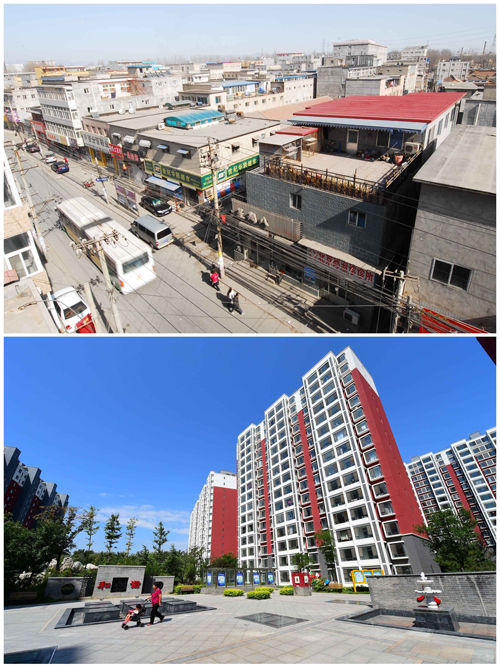 上圖為2010年拍攝的北京唐家嶺地區城中村;下圖為2014年8月拍攝的環境得到改善的唐家嶺地區回遷樓