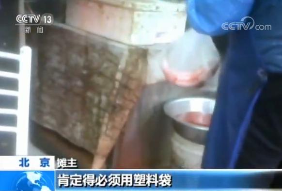 攤主:肯(ken)定得必須(xu)用(yong)塑料袋,要不怎么(me)裝(zhuang)呀,一個袋還不行(xing),有(you)的魚要漏(水),就得兩個。