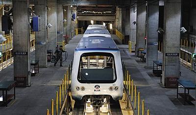 為了保(bao)證(zheng)小(xiao)火車(che)安全運行,在(zai)位于地下(xia)十六(liu)米(mi)(mi)的首都機場(chang)博(bo)維公司維修(xiu)車(che)間,原(yuan)本(ben)三節一組的列車(che)被拆(chai)分(fen)開(kai),十余位工(gong)作人(ren)員正(zheng)在(zai)對(dui)捷運列車(che)進(jin)行例行檢修(xiu)。隨(sui)著千(qian)斤頂的緩慢抬升,一節車(che)廂被抬升到離地一米(mi)(mi)的高度,兩(liang)名工(gong)作人(ren)員持(chi)手(shou)電對(dui)車(che)底進(jin)行檢修(xiu)。工(gong)作人(ren)員介紹,在(zai)列車(che)累計行駛達9600公里以上(shang)時都要進(jin)行一次系(xi)統(tong)檢修(xiu)。