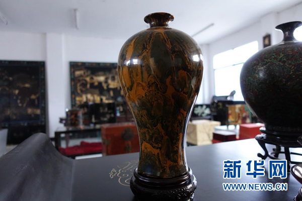 “流淌漆”技藝制作的花瓶。“流淌漆”即通過變換液態漆的濕度及流下的角度,使之形成自然的漆面花紋。新華網 卓越 攝